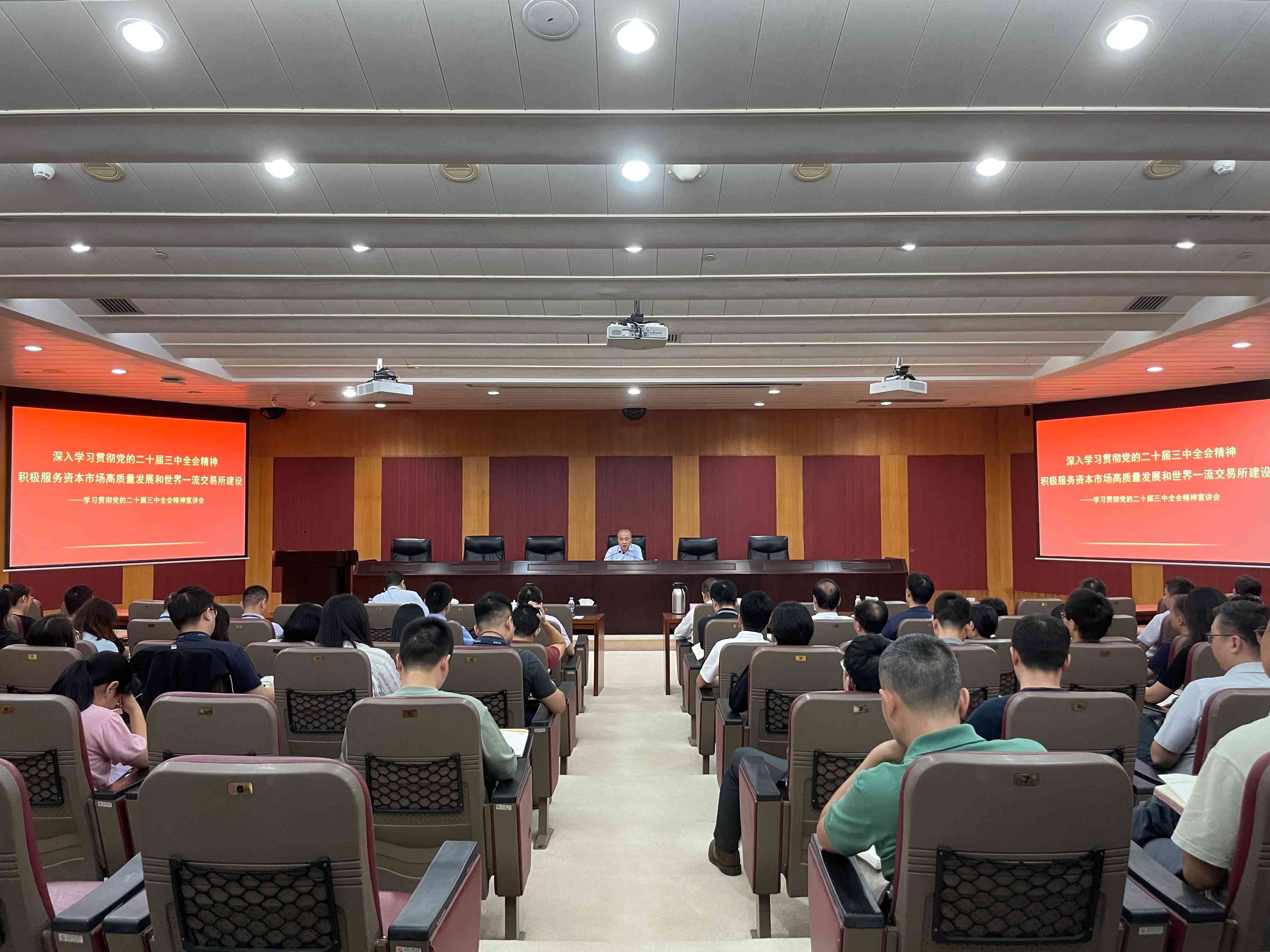 9月20日,公司召開(kāi)學(xué)習貫徹黨的二十屆三中全會(huì )精神宣講會(huì ),黨委書(shū)記、董事長(cháng)周暉以“深入學(xué)習貫徹黨的二十屆三中全會(huì )精神 積極服務(wù)資本市場(chǎng)高質(zhì)量發(fā)展和世界一流交易所建設”為題向全體黨員干部作專(zhuān)題宣講。