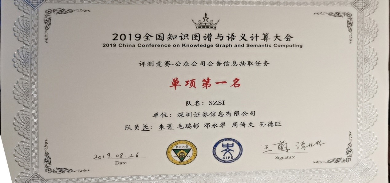 2019年8月24日至27日,在中文信息學(xué)會(huì )舉辦的全國知識圖譜與語(yǔ)義計算大會(huì )(CCKS2019)上,我司數據中心大數據項目組參加了上市公司公告信息抽取評測任務(wù),與國內80余高水平支隊伍進(jìn)行了激烈角逐,獲得了文本信息單項第一的好成績(jì)。受會(huì )議邀請,朱菁代表項目組赴會(huì )分享評測論文《An Information Extraction Approach Based onDomain Language Model》(一種基于領(lǐng)域語(yǔ)言模型的信息抽取方法)。